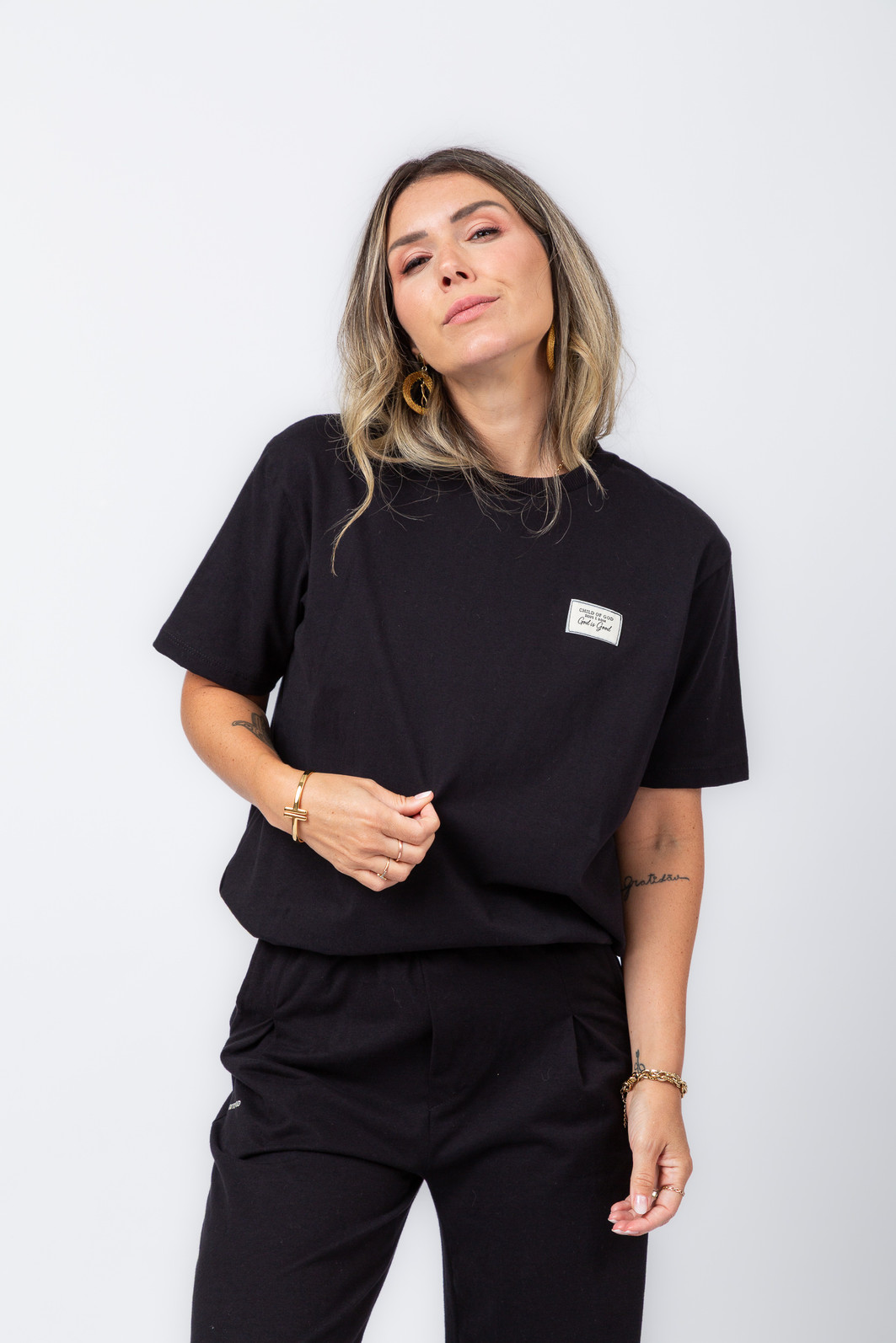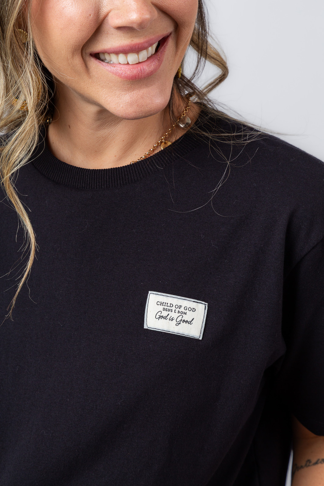 A etiqueta com detalhe minimalista, relembra uma verdade simples e profunda: Deus é bom o tempo todo — e essa mensagem faz dessa peça muito mais do que uma camiseta.
